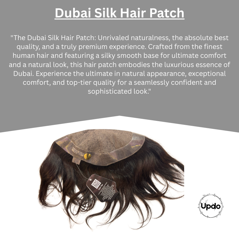 “The Dubai Silk Hair Patch: Unrivaled naturalness, the absolute best quality, and a truly premium experience. Crafted from the finest human hair and featuring a silky smooth base for ultimate comfort and a natural look, this hair patch embodies the luxurious essence of Dubai. Experience the ultimate in natural appearance, exceptional comfort, and top-tier quality for a seamlessly confident and sophisticated look.”